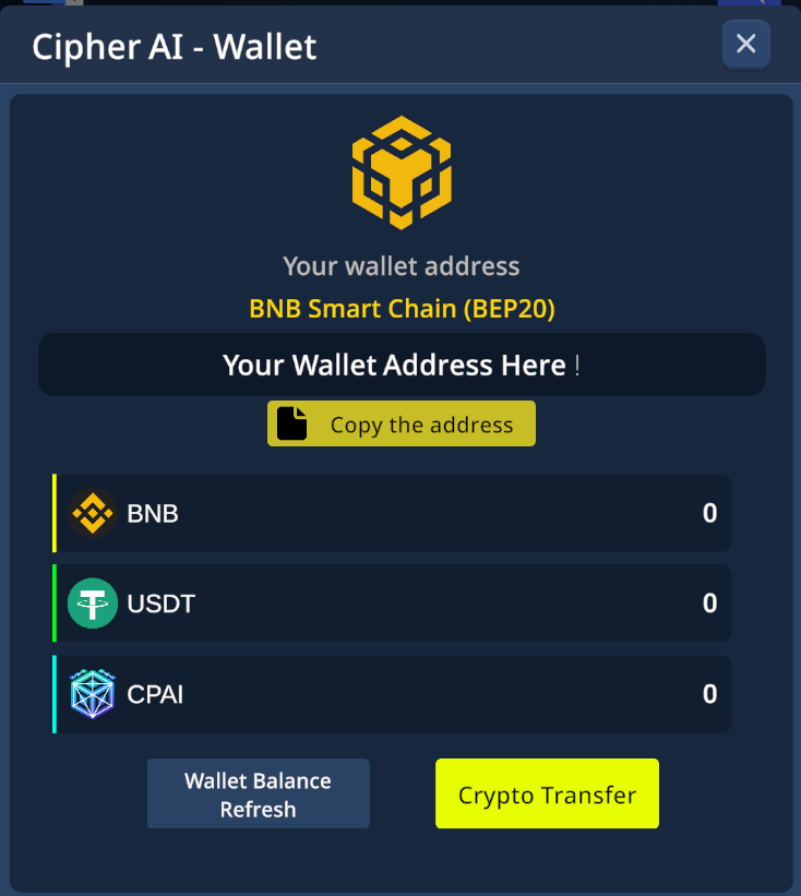 2. The **BEP20** address of the wallet you created will be written here. You can copy it by clicking copy. You can send **USDT**, **BNB** and **CPAI** to this wallet address or make crypto withdrawals. Remember, when shooting or sending, the network **BEP20** should be selected.